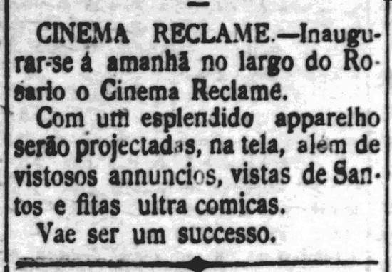 19/8/1909 – 11/2/1915 – Inaugurado em 1909 o Cinema Reclame, no Largo do Rosário (atual Praça Rui Barbosa), com projeção (ao ar livre) de anúncios, "fitas ultracômicas" e vistas de Santos. Volta a ser citado em A Tribuna em 11/2/1915, em pequeno anúncio: "Carnaval – Carro Cinema Reclame– Para os anúncios neste carro, dirijam-se ao Largo do Rosário n. 30, sala n.9, das 8 horas às 18".