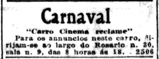 Em 1915, o Carro Cinema Reclame aceitava anúncios para o Carnaval