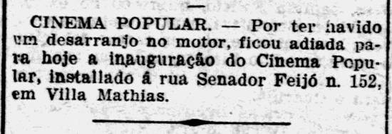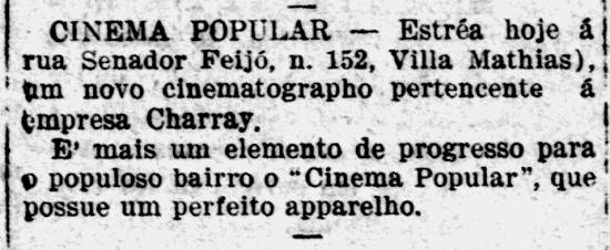 8/4/1910 a 18/2/1953 – Cinema Popular, primeiro desse nome, na Senador Feijó, 152, Vila Mathias, pertencente à empresa Charray. Deveria estrear no dia anterior (dia 7/4), mas houve falha no motor do projetor. Em 14/2/1953, anunciava-se que o cinema estava reservado para bailes carnavalescos da Sorocabana e no dia 18/2 iniciou um período interminável como "fechado para reforma".