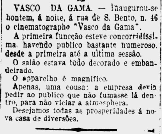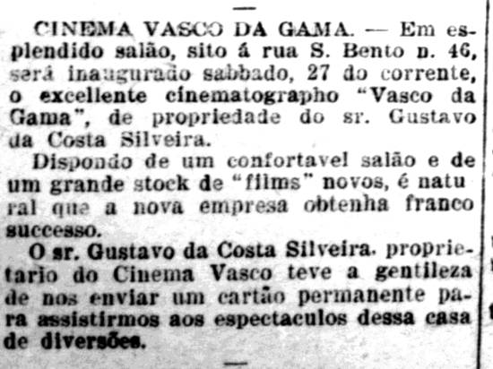 27/8/1910 – Surge o Cinema Vasco da Gama, na Rua São Bento, 46, no Valongo, de propriedade de Gustavo da Costa Silveira, com um confortável salão e grande estoque de filmes novos. Teve efêmera duração, até o final do ano.