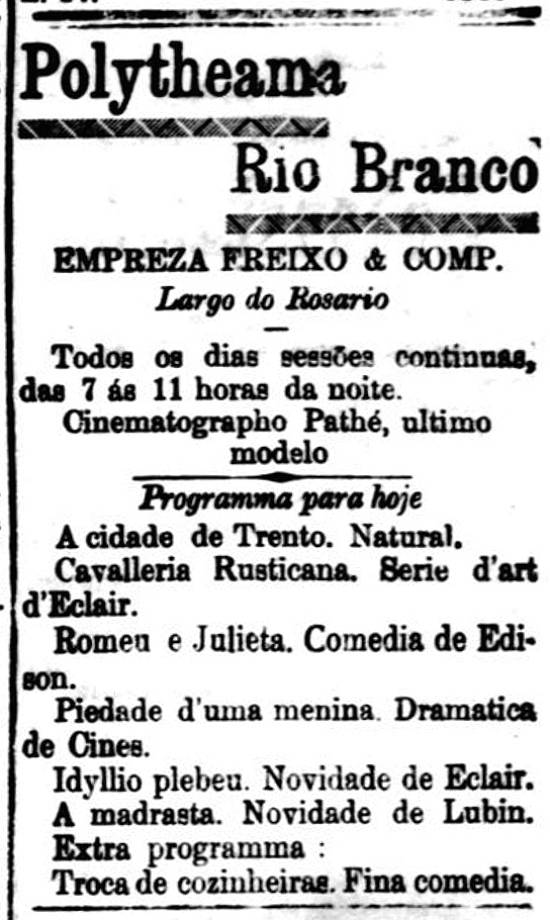 15/6/1910 a 11/6/1932 – Inaugurado o Polytheama Rio Branco, no Largo do Rosário (atual Praça Rui Barbosa), nº 4, no Centro, com renda em benefício da entidade assistencial Gota de Leite. Conhecido como "O cinema do set santista", tinha poltronas em estilo americano, duas linhas laterais de varandas, além de frisas em posição destacada. Era um cinema líder (lançador de filmes) em Santos. [[Mais...]].