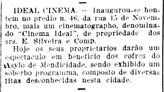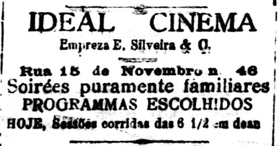 15/9/1910 a 21/1/1911 – Inaugurado o Ideal Cinema, na Rua XV de Novembro, 46, no Centro, pertencente a E. Silveira e Comp. No dia seguinte (16), ocorreu espetáculo em benefício do Asylo de Mendicidade, com diversos filmes novos.
