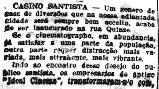 Em 23/1/1911, A Tribuna citava o destino que havia sido dado às instalações do Ideal, reaberto dois dias antes: "Casino Santista – Um gênero de casa de diversões que na nossa adiantada cidade será sempre bem aceito, acaba de ser inaugurado na rua Quinze. Se o cinematógrafo, em abundância, já satisfaz a uma parte da população, outra parte requer distração mais variada, mais atraente, mais vibrante. Indo ao encontro desse desejo do público santista, os empresários do antigo Ideal Cinema transformaram-no completamente em um verdadeiro casino, para o qual contrataram escolhidos artistas, entre os quais cançonetistas nacionais, francesas, espanholas e italianas. Assim, o público que o frequente passará ali algumas alegres horas, ouvindo agradável música e chuchurriando um copo de cerveja ou um cálice de licor (...)".