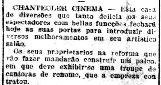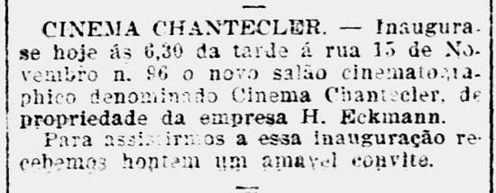 Chantecler fechou as portas em 18/1/1911, para melhoramentos. Voltou com outro nome: Cine Brasil Jornal A Tribuna, 18/1/1911, página 2