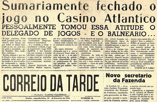 Em 27/2/1950 o Correio da Tarde destacava em manchete o fechamento do cassino que funcionava no Hotel Atlântico, mas maliciosamente completava o título: "- E o Balneário...". E complementava a matéria citando a continuidade dos bingos (como o dos altos do Coliseu), acobertados pela capa da benemerência. [[Mais...]].