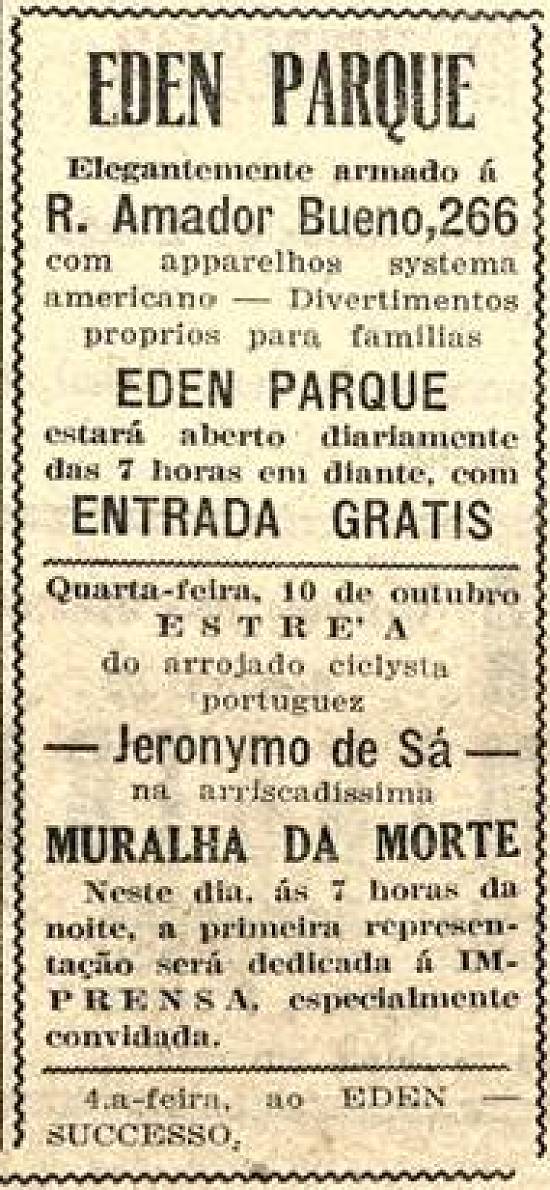 10/10/1928 a 1931 – Eden Parque, um parque de diversões na Rua Amador Bueno, 266, pertencente à empresa de Daniel Bernardes e outros sócios.