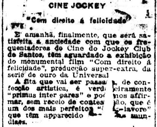 Último anúncio de programação do Cine Jockey Club foi em 1931, mesmo ano do encerramento das atividades em Santos
