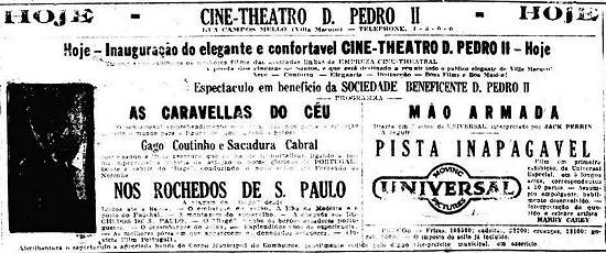 Dias depois, em 10/6, o estabelecimento da Empreza Cine-Theatral foi inaugurado, com espetáculo em benefício da Sociedade Beneficente D. Pedro II, composto pelos filmes As Caravelas do Céu e Nos Rochedos de S. Paulo (homenagens aos aviadores lusos Gago Coutinho e Sacadura Cabral), Mão Armada e Pista Inapagável (ambos da produtora Universal Pictures).