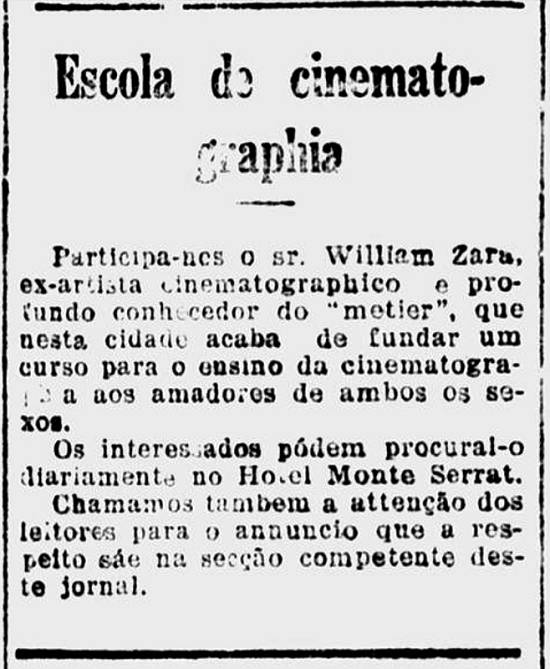 12/8/1922 – O crescente interesse pelo cinema começava no entre-guerras a impulsionar outras atividades, como o ensino das artes e técnicas da "Sétima Arte". No Hotel Monte Serrat, na Praça Correa de Melo, os interessados poderiam procurar o sr. William Zara, que se apresentava como "ex-artista cinematográfico e profundo conhecedor do métier, que nesta cidade acaba de fundar um curso para o ensino da cinematografia aos amadores de ambos os sexos". A nota redatorial chamava também a atenção dos leitores para um anúncio publicado "na seção competente deste jornal" - e que não parece ter sido publicado em nenhuma data próxima...