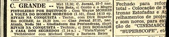 Em 6/4/1958, um domingo, o Cine Campo Grande anunciou a exibição na matinê das 13h30 de um cinejornal brasileiro, do filme Vira Bota (com os humoristas Gordo e Magro), de Pistoleiro por Equívoco, dos episódios 14 e 15 (finais) da série A Volta do Homem Morcego e Rivais na Conquista.