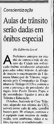26/9/1998 a 31/8/2010...* – Cine Trânsito, em um ônibus adaptado para apresentar em seu interior filmes voltados à educação no trânsito, foi entregue à população em 1998, no encerramento da I Semana Municipal de Trânsito. O ônibus, adaptado nas oficinas da Companhia de Engenharia de Tráfego (CET), serve como sala de aula, com bancos para 38 crianças, cortinas e equipamentos multimídia, som ambiente, vídeo e telões, computador lap-top e ar condicionado. A última referência encontrada ao projeto data de 31/8/2010. [[Mais...]].