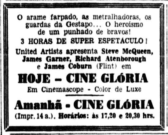 No alto do anúncio, a marca do Cinema I, e no rodapé a instrução para "tratar no Cine Glória" - ambos no mesmo endereço.