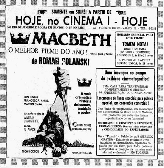 Macbeth, sim: Cinema I é "um cinema de arte, sem concessões" Jornal A Tribuna, 17/2/1973, página 5/2º caderno