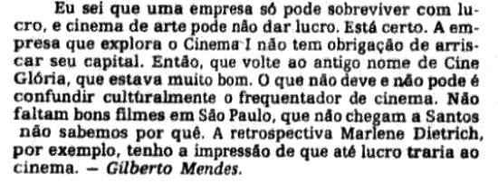 Gilberto Mendes, na Tribuna do Leitor, opina sobre o Cine Glória Jornal A Tribuna, 12/1/1976, página 2