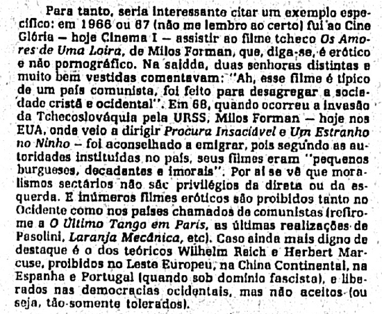 Francisco Teixeira Rienzi, na Tribuna do Leitor: moral e cartazes. Lembrando filme Os Amores de Uma Loira, de Milos Forman, assistido no Glória em 1966 ou 1967