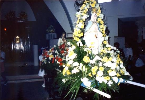 finalmente a Virgem Maria enfeitada de joias de ouro, carregada por moças da paróquia que usavam saia rosa e camisa branca, tendo à sua frente muitas crianças vestidas de anjinhos.