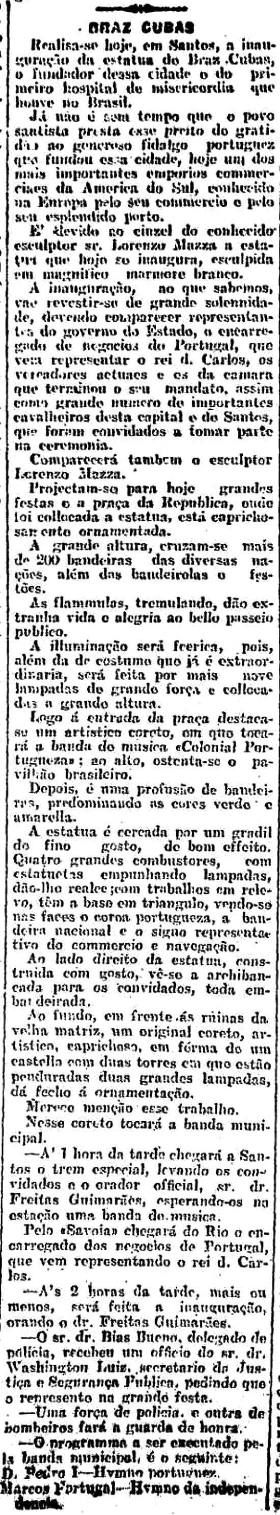 em nome da colônia portuguesa, agradecendo a homenagem prestada a um português como Braz Cubas, elogiando o comendador Alfaya, que foi o primeiro