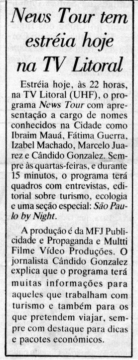 Estréia hoje, às 22 horas, na TV Litoral (UHF), o programa News Tour com apresentação