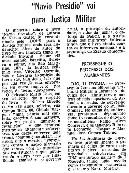 informava que o navio iria sofrer uma correição da Justiça Militar, requerida pelo criminalista João Bernardes da Silva. Já na véspera, havíamos
