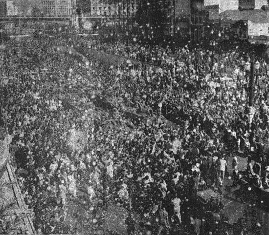vibrou intensamente, com povo nas ruas e sacadas de edifícios. No clichê, à esquerda, ao alto, flagrante da chegada do presidente de Portugal ao