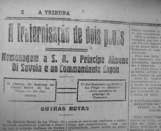 No Grande Hotel de La Plage, no Guarujá, realizou-se ontem o almoço que a colônia italiana de Santos de Santos ofereceu a s.a. o príncipe Aimone di Savoia-Aosta, e ao capitão-de-mar-e-guerra Augusto Capon, comandante do couraçado Roma.
