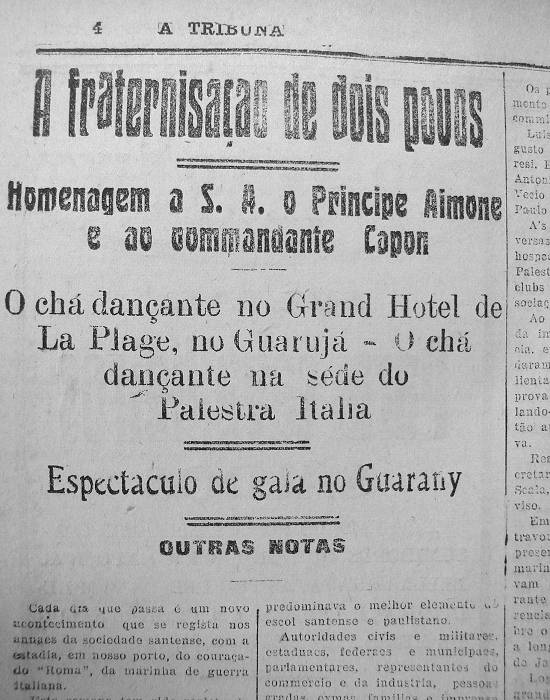 Ao champanha, os representantes da imprensa e o sr. Vicente Garcia, em nome da A. S. S. A. (N.E.: sigla de Associação Santista de Sports Athleticos), saudaram a diretoria do Palestra, salientando a significação daquela prova de fraternidade e congratulando-se com esse clube esportivo por tão auspiciosa e oportuna iniciativa.