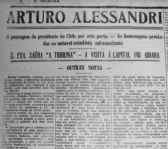 Arturo Alessandri, presidente do Chile, que, por algumas horas, foi hóspede de nossa cidade, endereçou um cordial telegrama ao dr. Estácio Coimbra,