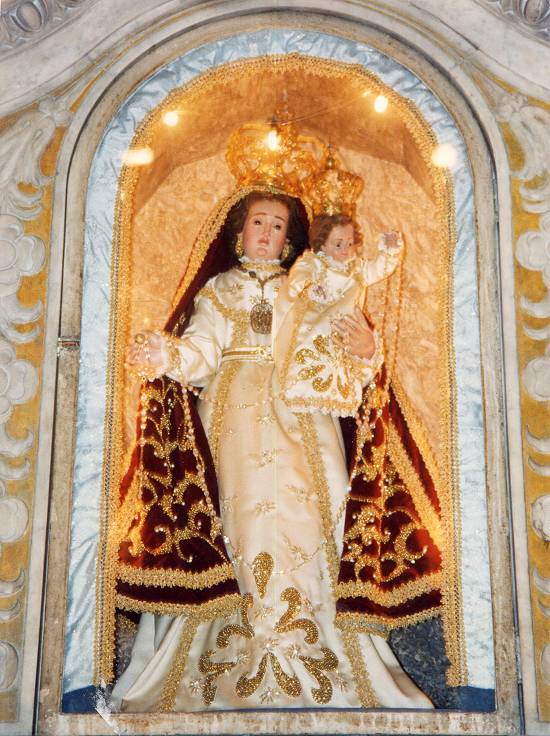 das contas do antigo rosário de madeira; na mão esquerda segura seu filho Jesus, seguindo a antiga iconografia, apenas estando de pé, ao contrario da visão de São Domingos de Gusmão onde a virgem estaria sentada. Está vestida com uma túnica branca