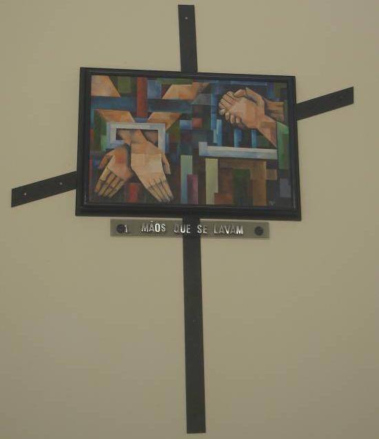 sentadas. No seu altar, de linhas simples, há apenas uma cruz, que pesa mais de 100 quilos, de madeira e vidro colorido, com luzes internas,