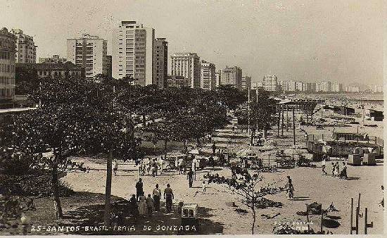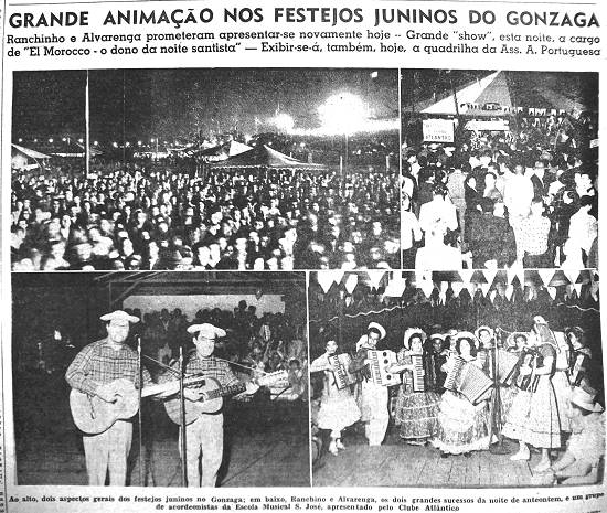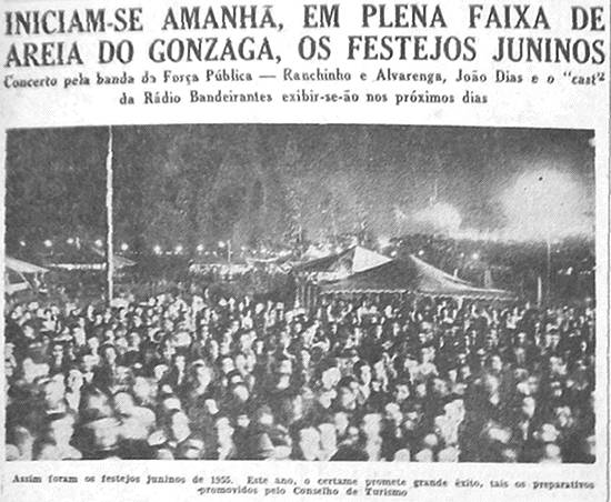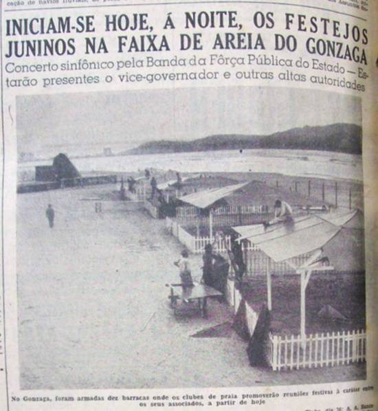montagem da Cidade Junina nas areias da praia do Gonzaga. Em 1955, a festa junina incluía a montagem de uma estrutura especial na faixa de areia, como noticiou o jornal A Tribuna em 28 de junho daquele ano, na página 5:
