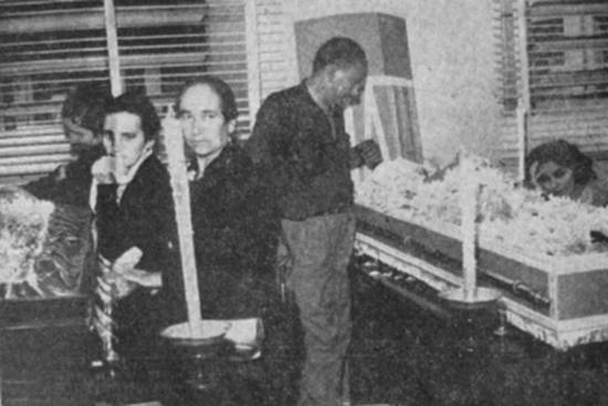 (...) Logo nas primeiras horas da manhã, grande número de pessoas compareceu ao necrotério para fazer a identificação dos primeiros mortos encontrados (foto inferior, no canto direito do clichê). (...)