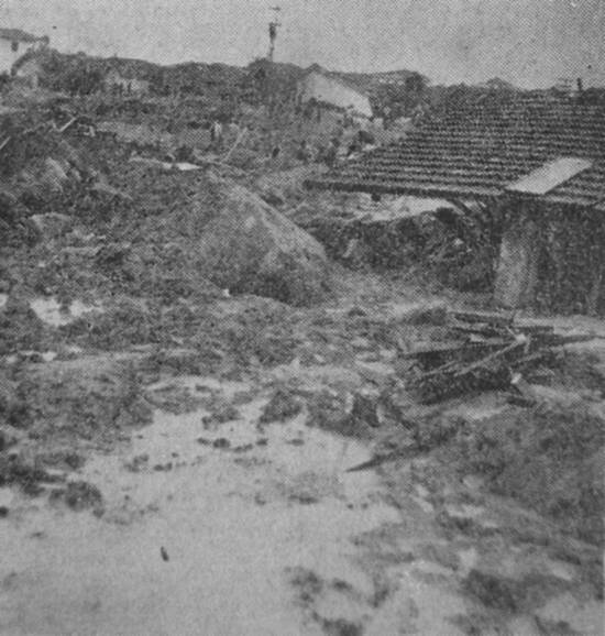 O chalé da foto de cima foi arrastado a dezenas de metros do seu local primitivo. Seu telhado desabado encontra-se sobre os escombros da casa de frente, a mais de dois metros acima do nível da rua. (...)