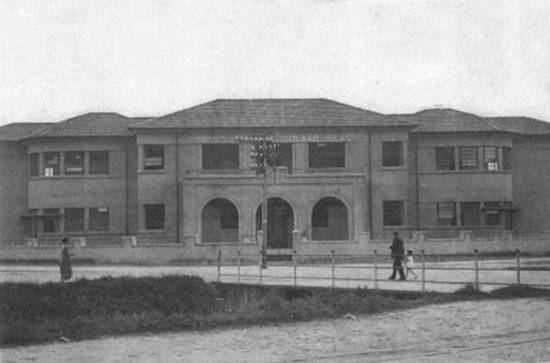 Fachada do prédio do antigo Grupo Escolar Municipal Olavo Bilac, que continua funcionando na esquina da Rua Carvalho de Mendonça e Avenida Pinheiro Machado, no Campo Grande. Datada da década de 1950, a foto é do acervo de Walter Arias Gouvêa