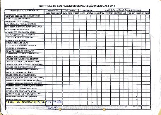 Ficha para entrega de equipamentos de proteção individual (EPIs), de 19/10/1998