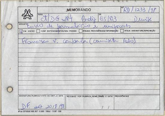 Memorando da Telesp sobre envio de uniformes, de 20/8/1998