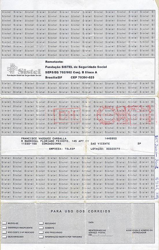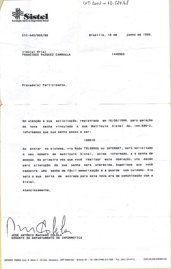 Frente e verso de mensagem ao funcionário para acesso ao sistema informatizado da Fundação Sistel de Seguridade Social, em 18/6/1999