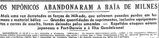 referiam à frente de batalha asiática: "Os nipônicos abandonaram a Baía de Milnes - Mais uma vez derrotadas as forças do Mikado, que sofreram