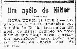 a nota: "Um apelo de Hitler - NOVA YORK, 31 (U.P.) - Urgente - A 'BBC' anunciou que a rádio de Berlim transmitiu um apelo de Hitler pedindo ao