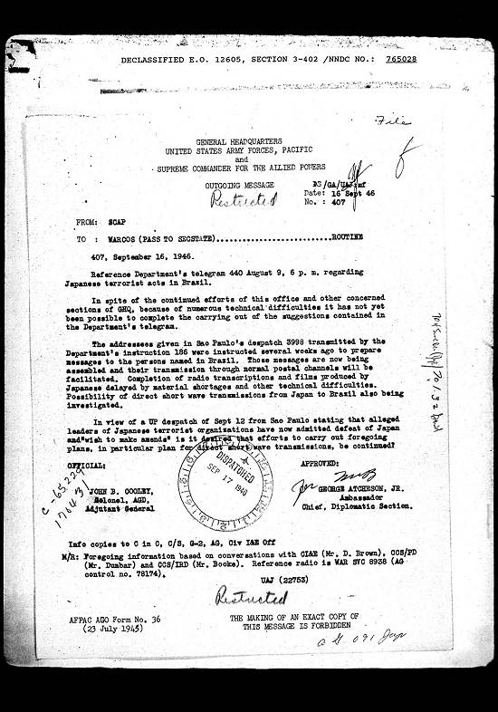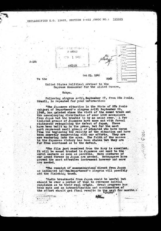 A Secretaria Interina de Estado inclui um memorando sobre o atual problema japonês no Brasil e uma