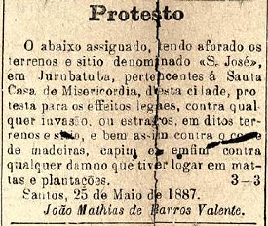 Começava a ser despertado o interesse pela área continental de Santos e os proprietários de terrenos tratavam de garantir sua posse com a publicação de anúncios como este, em que João Mathias de Barros Valente afirmava seus direitos sobre o aforamento de área do sítio "S. José", em Jurubatuba, antes pertencentes à Santa Casa de Misericórdia de Santos