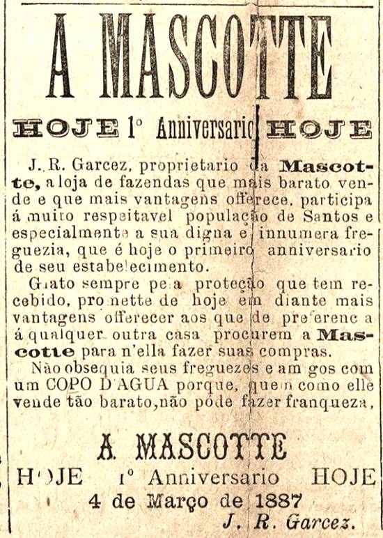 Loja de tecidos A Mascotte - 1º aniversário: "Não obsequia seus freguezes e amigos com um COPO D'ÁGUA porque, quem como elle vende tão barato, não póde fazer franqueza" ('copo d'água' é referência de forma modesta a um coquetel de recepção a convidados)