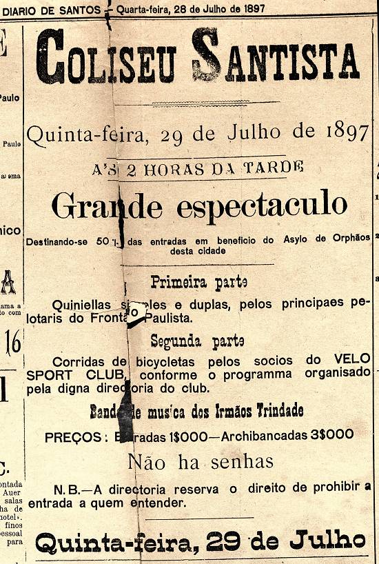 Uma das primeiras atividades anunciadas pelo Coliseu Santista após a sua inauguração em 14/7/1897 foi este espetáculo que ocorreria no dia 29 de julho