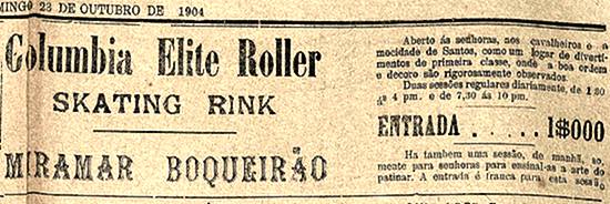 Em funcionamento o Columbia Elite Roller Skating Rink, no complexo Miramar Boqueirão, para a patinação e "divertimentos de primeira classe, onde a boa ordem e decoro são rigorosamente observados" Publicado no jornal Diário de Santos, em 23 de outubro de 1904, página 3 Imagem: Hemeroteca da Biblioteca Nacional - Rio de Janeiro/RJ