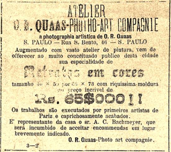 Atteliê de pintura e foto artística de O.R. Quaas, sediado na capital paulista, nomeia A. C. Bachmeyer como representante em Santos, para aceitar encomendas que serão executadas em cores por artistas parisienses Publicado no jornal Diário de Santos, em 23 de outubro de 1904, página 3 Imagem: Hemeroteca da Biblioteca Nacional - Rio de Janeiro/RJ