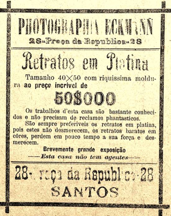 Photographia Eckmann, que "não tem agentes" e cujos trabalhos "são bastante conhecidos e não precisam de reclamos fantásticos", destacando os retratos feitos em platina, que não perdem a qualidade como os retratos baratos em cores
