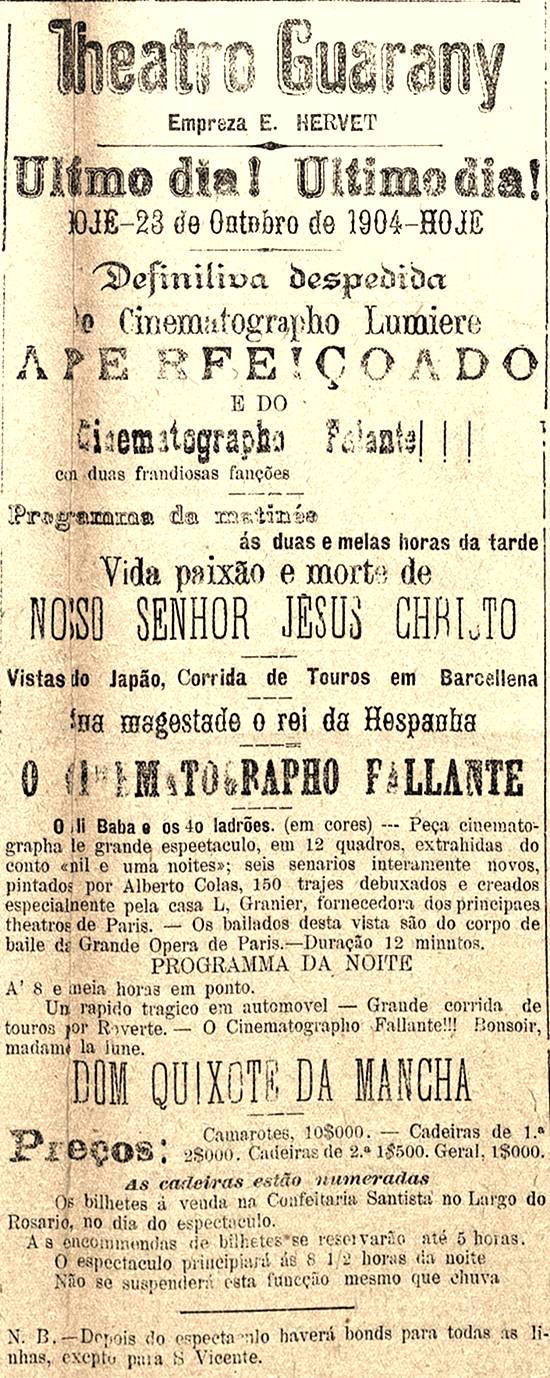 Theatro Guarany - Empresa E. Hervet - despedida do Cinematógrafo Lumière aperfeiçoado e do Cinematógrafo Falante. Após o espetáculo "haverá bondes para todas as linhas, exceto para S. Vicente" Publicado no jornal Diário de Santos, em 23 de outubro de 1904, página 3 Imagem: Hemeroteca da Biblioteca Nacional - Rio de Janeiro/RJ