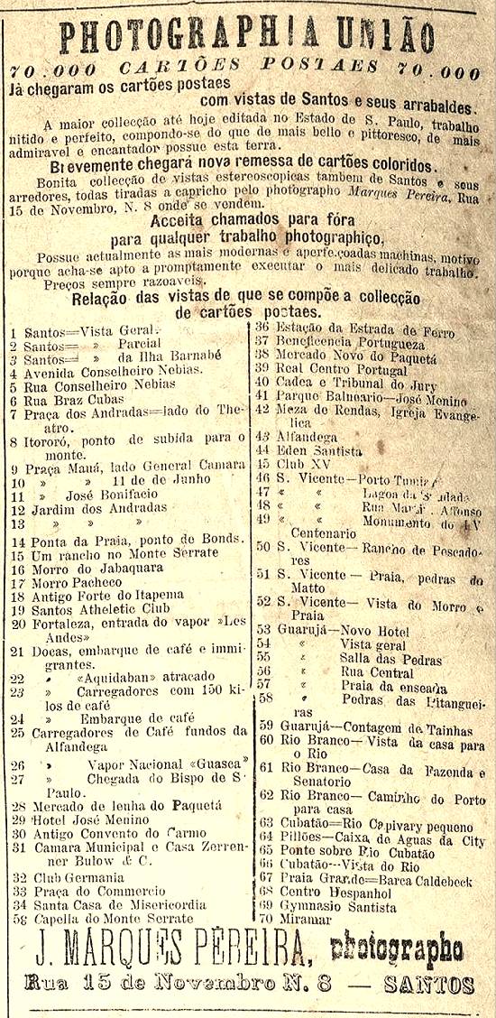 Photographia União - José Marques Pereira, fotógrafo - nova coleção de cartões postais de Santos, "a maior coleção até hoje editada no Estado de São Paulo" Publicado no jornal Diário de Santos, em 25 de outubro de 1904, página 3 Imagem: Hemeroteca da Biblioteca Nacional - Rio de Janeiro/RJ