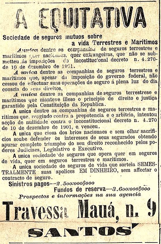 A Equitativa, de Santos, única que não se submeteu a um decreto inconstitucional de 1901 Publicado no jornal Diário de Santos, em 31 de dezembro de 1904, página 6 Imagem: Hemeroteca da Biblioteca Nacional - Rio de Janeiro/RJ