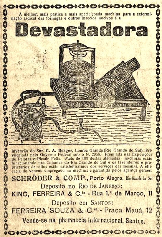 Ferreira Souza & Cia. e Pharmacia Internacional, Santos - Devastadora, a aparelhagem para extermínio de formigas com formicida, inventada no Rio Grande do Sul por C.A. Berger Publicado no jornal Diário de Santos, em 1 de janeiro de 1904, página 3 Imagem: Hemeroteca da Biblioteca Nacional - Rio de Janeiro/RJ