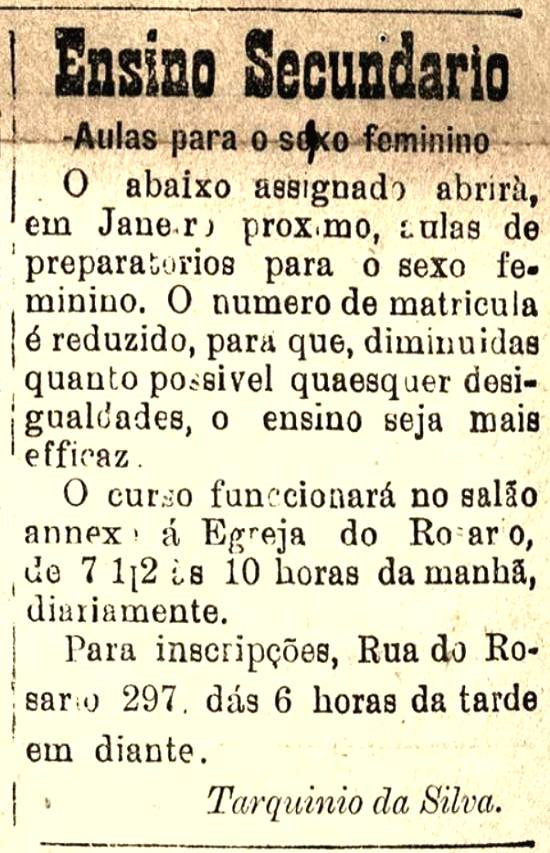 Professor Tarquínio da Silva inicia curso de preparativos para o Ensino Secundário, para alunas do sexo feminino, que funcionaria no salão anexo à Igreja do Rosário, diariamente pela manhã Publicado no jornal Diário de Santos, em 1 de janeiro de 1904, página 3 Imagem: Hemeroteca da Biblioteca Nacional - Rio de Janeiro/RJ